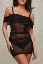 Define your curves with the nightwear Showstopper black ruched mesh slip. The off the shoulder band reveals the bare shoulders for that provocative look. The slip features bra style adjustable straps and gold metal hardware for that added support.