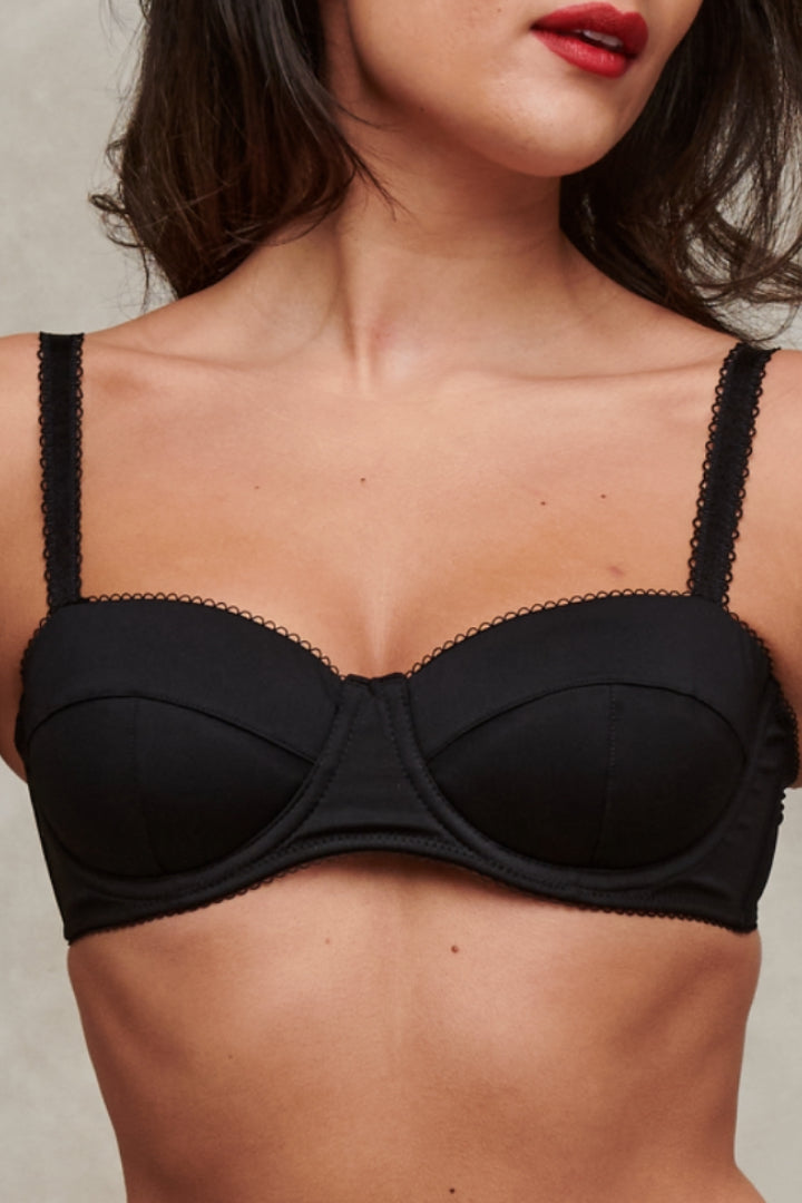 The Wardrobe Mistress black picot trimmed microfibre bra, balcony style with padding for a comfortable fit. The fabric skims the body giving a beautiful silhouette. Perfect for everyday dressing, Raine & Bea’s signature designs are a must have for any underwear drawer.