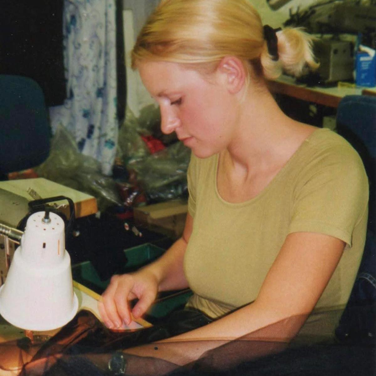 I was a sample machinist in Manchester working in the design room age 19 sewing women’s wear. It was whilst working here that I gained the most of my experience. One of my first jobs was creating a green satin pair of hot pants for designer Maria Grachvogel. The hot pants I sewed were later worn by Victoria Beckham at the MG fashion show in 2000; the image of Beckham wearing those hot pants is now one of the most iconic photos of her.